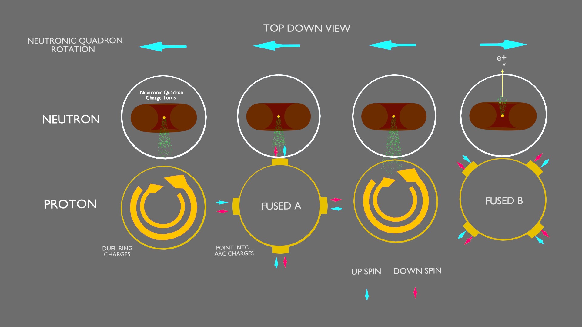 As the quadrons move inward toward the center of the proton their linear velocity begins to slow, due to the repulsive nature of their similar charges. This action causes the concentrated double ring charges, at the proton poles, to collapse back upon the four particles from which they were generated, in an effort to maintain the particle velocities (Self induction). However, the four quadron charge fields have been combined, divided in half and rotated 90 degrees from the direction in which they were originally radiated. They are now in the form of two diametrical spinning rings of similar charge, focused upon a point at the center of the proton.
