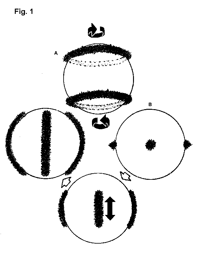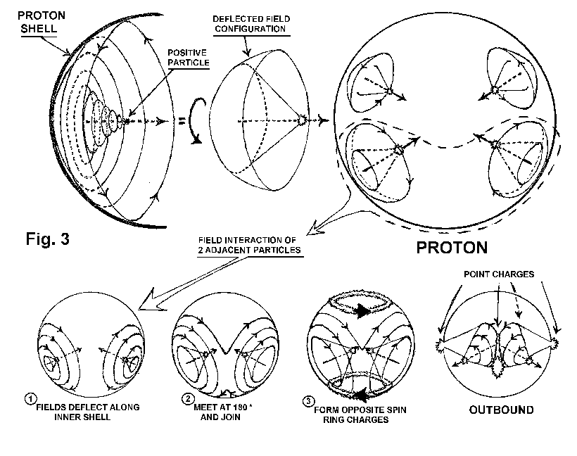 Applying this field concept, and starting at the farthest points from the proton center, the four quadrons are pushed inward. They are repelled by their own charge fields, which are mirrored in the containing energy-mass sphere. As the particles take on a relative linear motion they each radiate a spinning, obtuse, conical energy field at right angles to their respective motion. As these spinning energy fields expand outward, at the velocity of light, they encounter the proton shell and are deflected around and along its inner physical surface. As the particles progress inward, these four energy fields generated at an angle of 90 degrees to each other, expand and curve around the inner surface of the shell to meet each other adjacently at an angle of 180 degrees. It is known that when charge fields, of the same spin direction, encounter each other at an angle of 180 degrees they join together. (Electromagnetic field coupling) This charge field coupling is what creates the two counter spinning charge rings around the proton poles. The double charge rings, that are formed, keep the four quadrons oscillating within a plane, preventing close packing.See illustrations 1,2,3.