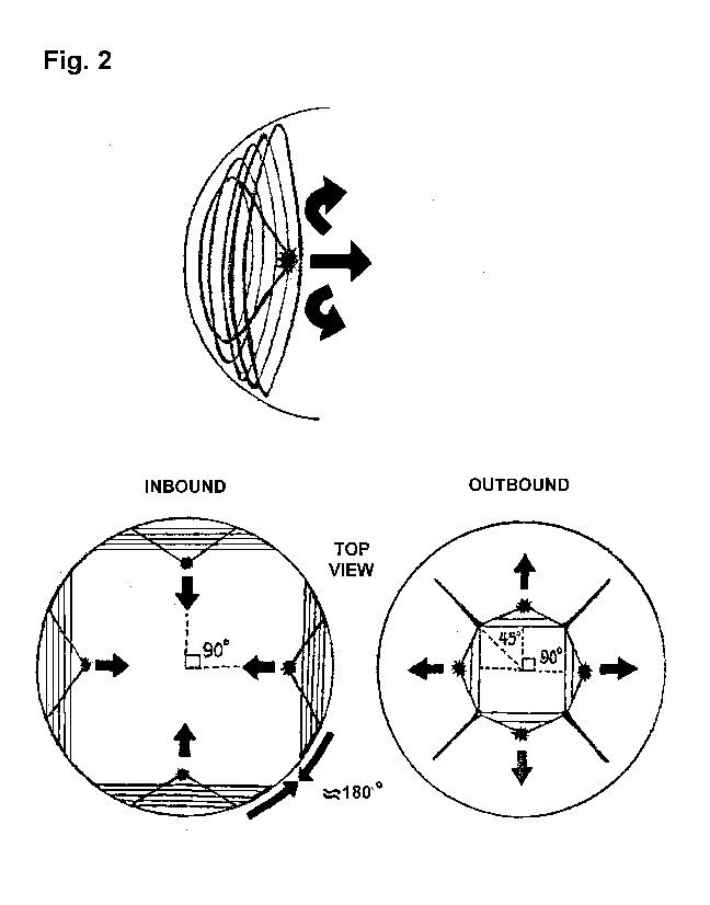 The quadron particles are repelled by the like charge of the newly created fifth positive particle and each other’s similar charge. (Like or same type charges repel each other, unlike charges attract.) The four quadrons would be sprung outward away from the proton center, toward the containing spherical shell. As the four quadrons travel outward their rotating charge fields expand and adjacently encounter each other at an angle of 90 degrees. Field coupling cannot occur as it did along the shell wall on the inward journey. The charge fields deflect each other adjacenty, outward toward the proton shell at an angle of 45 degrees relative to the oscillation paths of the quadron particles. A map analogy would have the quadron oscillation paths at the North, south, east and west locations while the deflected charge fields would be at the Northeast, southeast, northwest and southwest positions. The charge fields, which travel at the velocity of light, lead the quadron particles outward toward the proton shell. When the deflected fields first encounter the proton shell they appear as four point charges equally displaced around the equator. These point charges expand into the linear arc charges as the four quadrons move closer to the proton shell and more of their deflected charge fields encounter it.